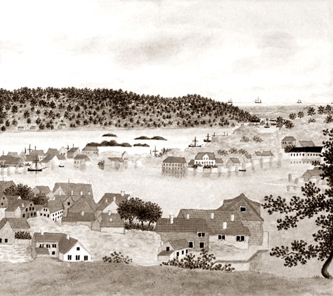 I øst, til venstre i bildet, ser vi en snipp av Friholmens tette trehusbebyggelse, og av kanalen som runder det som senere ble Syrdalens hjørne. Tyholmens nordside med kirken og høydedraget dominerer i midten av bildet. Kirken vi ser, ble – med bibehold av tårnet – ombygd fra Y-form til åttekantform i årene 1833–36, men frøken Kølle har såmenn ikke gitt oss noe holdepunkt for å avgjøre om vi ser en y-kirke eller en åttekantkirke! Så slik sett kan datering til 1840-årene gjerne være korrekt. Ved kirken ser vi flere rødmalte gavlhus av 1600-tallstypen, mens Norges Banks senere bygning, det Schønbergske hus og fru Deviks hus – sistnevnte sterkt gult – fremheves som store bygninger. «Arken» – i dag Ritz medisinske senter – ser vi også, skjønt uten vinduer! I «Arken» ble det vevd linvarer og spunnet skråtobakksruller. Kanskje Catharine har glemt å sette de mørke vindusåpningene på plass etter at den mattrøde veggfargen var tørr?
