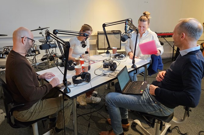 Podkastvertene Gaute Christian Molaug og Ingrid Nyquist i samtale med lokalpolitiker Erle Wright Severinsen (H) fra Kristiansand og kommunedirektør Vidar Homme fra Valle.